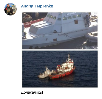 "Первым туда добрался бронекатер "Никополь". Его тянул малый разведывательный корабль. После него зашел "Бердянск", у которого была пробоина и он вообще не мог сам двигаться. И последним прибыл буксир "Яны Капу", - сообщают СМИ.