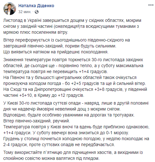 "Снижение температуры воздуха коснется 30 ноября западных областей, где сегодня еще - сравнительно тепло, а в субботу максимальная температура воздуха не превысит +1 +4 градусов. На севере и в большинстве центральных областей также ожидается пронизывающая холодом погода - потому что +2 +5 градусов и еще и сильный ветер. На Востоке и на Днепропетровщине ожидается +3 +8 градусов, в южной части +5 +10, в Крыму до +12 градусов", - написала Диденко.