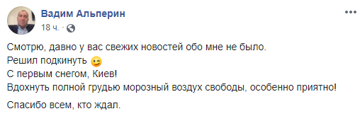 Об этом сообщили украинские СМИ, а затем и сам Альперин подтвердил, что уже может "вдохнуть воздух свободы", передает Час Пик.