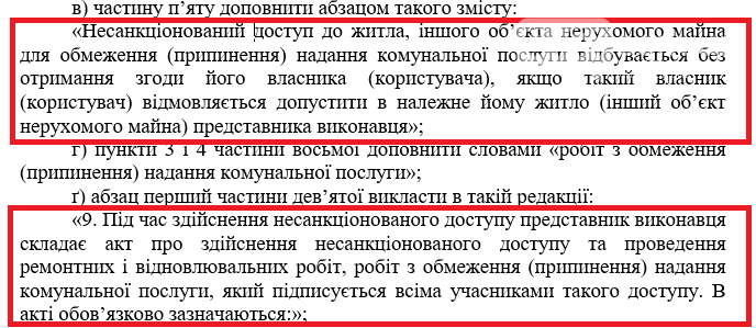 В принципе, норма о том, что коммунальные службы имеют право проникать в жилище любого украинца без разрешения хозяев, имеется в законодательстве и сейчас. В законе "О жилищно-коммунальных услугах" записано: "В неотложных случаях, связанных с необходимостью спасения жизни и здоровья людей и/или имущества… может быть осуществлен доступ к жилью, другому объекту недвижимого имущества без получения согласия его собственника (пользователя) (несанкционированный доступ) для проведения осмотра и ликвидации или предотвращения аварии".