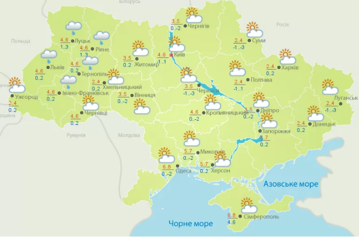На западе Украины переменная облачность, местами небольшой дождь, на дорогах ночью и утром местами гололедица, ветер юго-западный, 5-10 м/с. Температура воздуха ночью -2…4 градуса, днем 0…+7 градусов. В Карпатах местами небольшой дождь и мокрый снег, температура ночью 0…-5 градусов, днем 2…-3 градуса. В Моршине и Трускавце местами небольшой дождь, температура ночью 0…+2 градуса, днем +4…+6 градусов, в Сваляве ночью местами небольшой дождь, днем без существенных осадков, температура ночью 0…+2 градуса, днем +2…+4 градуса.