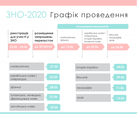 Начало внешнего независимого оценивания 2020 года положит тест по математике 21 мая. В этом же месяце абитуриенты сдадут тесты по украинскому языку и литературе, физике. Оценивание по другим дисциплинам продолжится с 1 июня по 15 июня 2020 года.