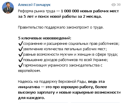 "Реформа рынка труда - 1000000 новых рабочих мест за 5 лет и поиск новой работы за 2 месяца", — написал он.