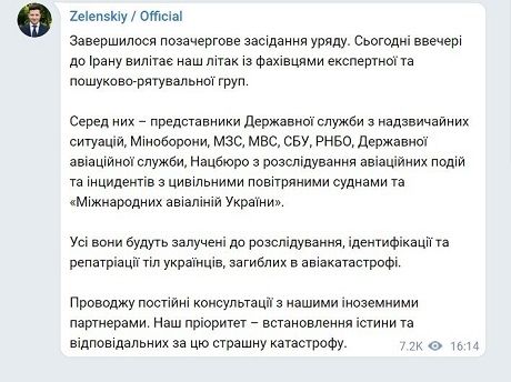 Сообщается, что в Тегеран отправят представителей Государственной службы по чрезвычайным ситуациям, Минобороны, МИД, МВД, СБУ, СНБО, Государственной авиационной службы, Нацбюро по расследованию авиационных происшествий и инцидентов с гражданскими воздушными судами и «Международных авиалиний Украины».