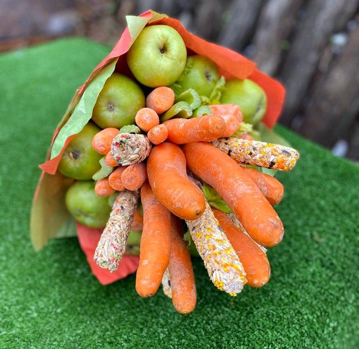 По прогнозу Тимки, следующая зима будет такой же малоснежной, как и эта. За "работу" зверьку вручили награду - букет из злаков, яблок и морковки.