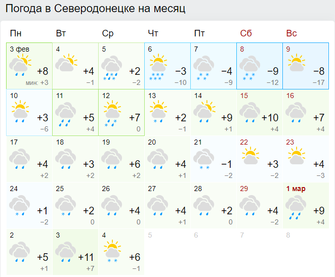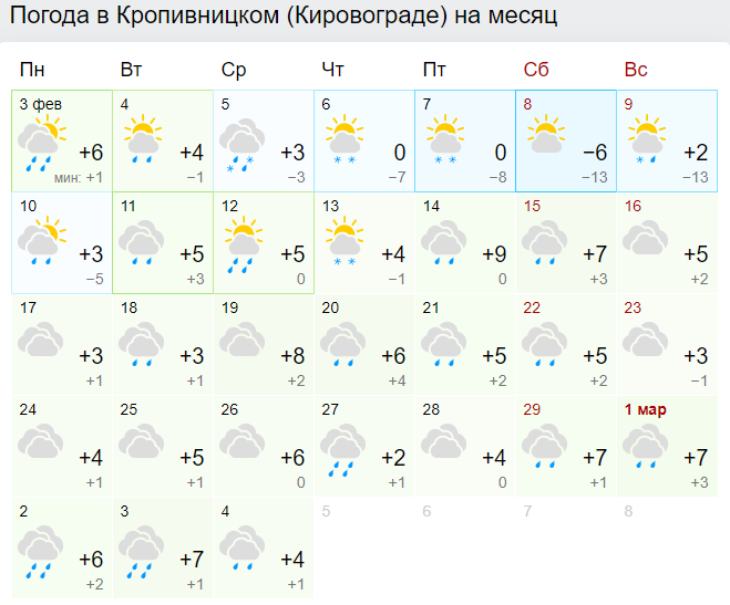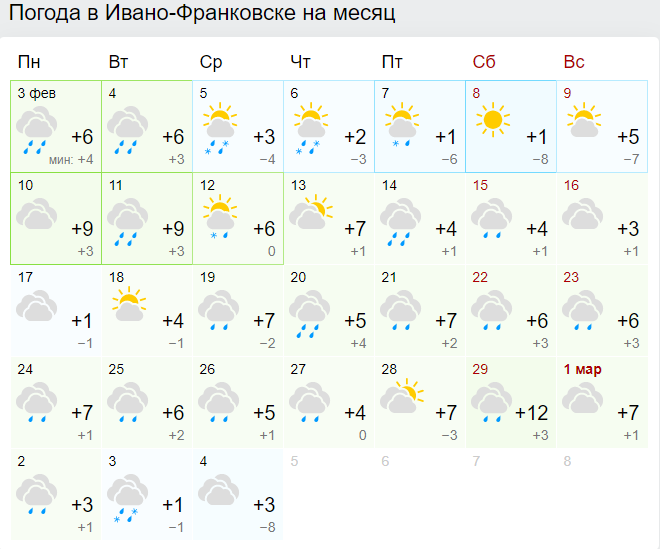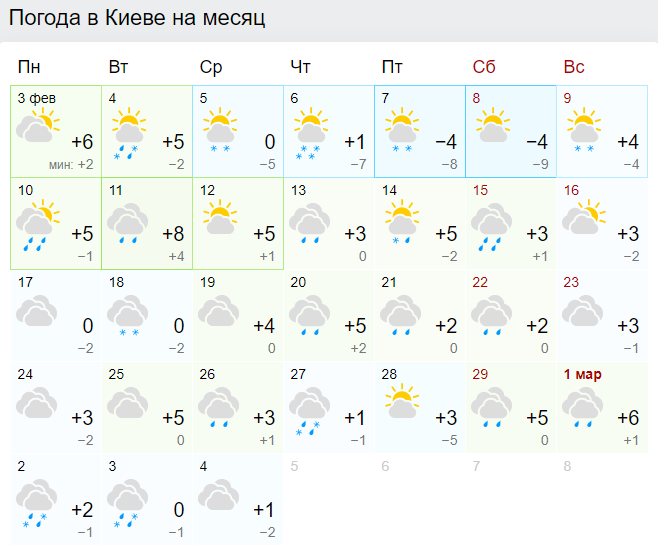 Так, ресурс Gismeteo сообщает, что в Киеве температура воздуха в ночь на 7 февраля упадет до -7 градусов. В пятницу и субботу дневная температура будет составлять -4 градуса, ночью до -9. Уже с воскресенья начнет теплеть и вновь пойдут дожди.