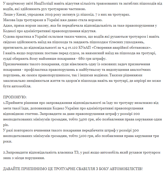 Автор петиции предлагает ввести за езду по тротуару штраф в размере 200 необлагаемых минимумов граждан, то есть 3400 грн, или лишение права управления автомобилем на один год. В случае же повторного совершения такого наказания предусмотреть штраф в размере 300 необлагаемых минимумов граждан, то есть 5100 грн, или лишение права управления на три года.