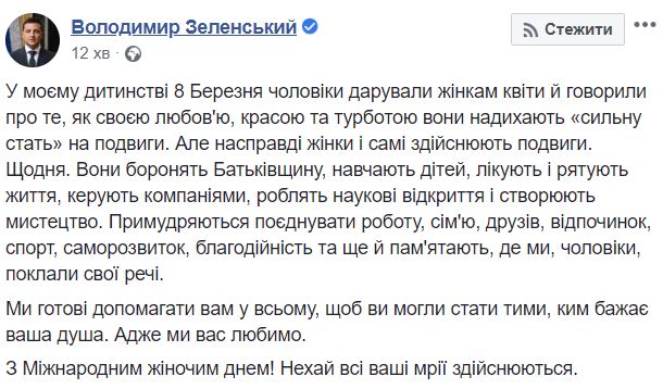 "В моем детстве 8 марта мужчины дарили женщинам цветы и говорили о том, как своей любовью, красотой и заботой они вдохновляют "сильный пол" на подвиги. Но на самом деле женщины и сами совершают подвиги. Ежедневно", - написал Зеленский.
