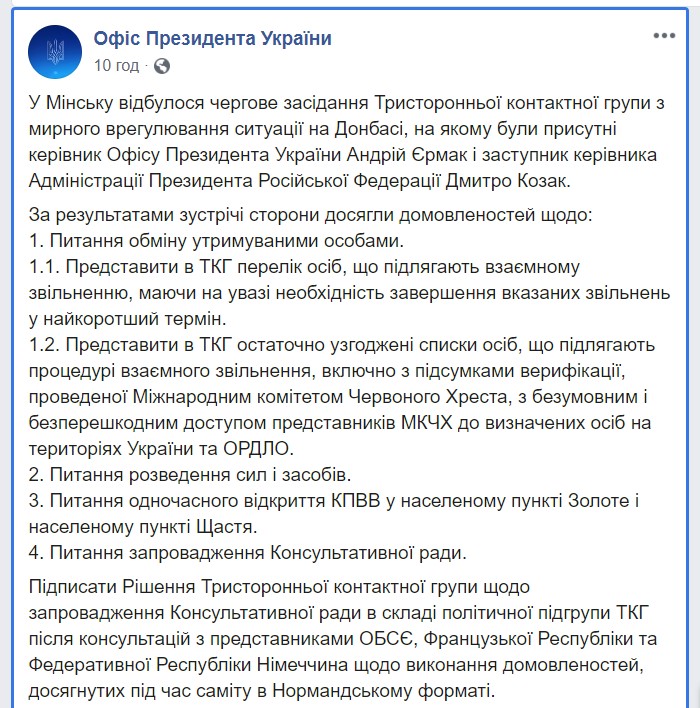 В Офисе президента сообщили, что стороны согласились предоставить в ТКГ перечень лиц для обмена и освободить указанных лиц в кратчайшие сроки, предоставить в ТКГ окончательно согласованные списки лиц, подлежащих процедуре взаимного освобождения, включая итоги верификации, проведенной Международным комитетом Красного Креста.