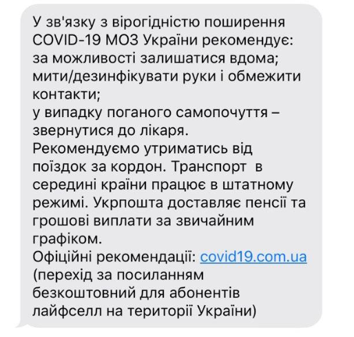 "В связи с вероятностью распространения COVID-19 МОЗ Украины рекомендует: по возможность оставаться дома; мыть/дезинфицировать руки и ограничить контакты; в случае плохого самочувствия обратиться к врачу. Рекомендуем воздержаться от поездок за границу. Транспорт в Украине работает в штатном режиме. Укпрочта доставляет пенсии и денежные выплаты по обычному графику", - говорится в СМС.
