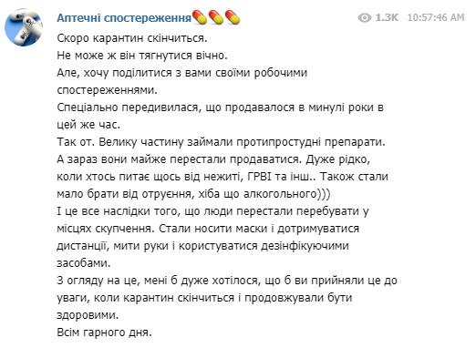 "Учитывая это, мне бы очень хотелось, чтобы вы приняли это во внимание, когда карантин закончится и продолжали быть здоровыми", - призвала фармацевт украинцев.