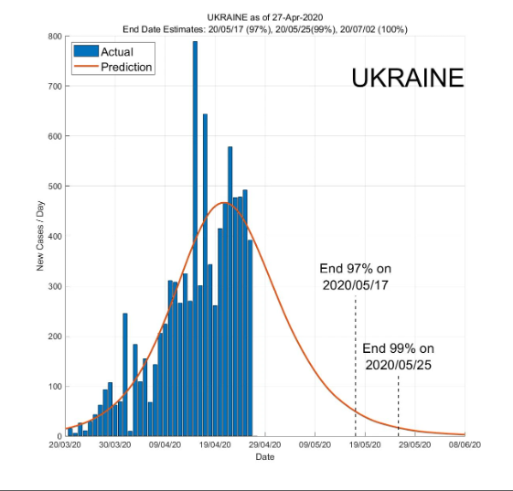 Из этой модели следует, что пик эпидемии COVID-19 в Украине уже прошел - он был примерно 20 апреля. По прогнозу, к 17 мая наша страна преодолеет 97% случаев коронавируса, к 25 мая будет побеждено 99% случаев болезни, а до 2 июля эпидемия в Украине закончится.