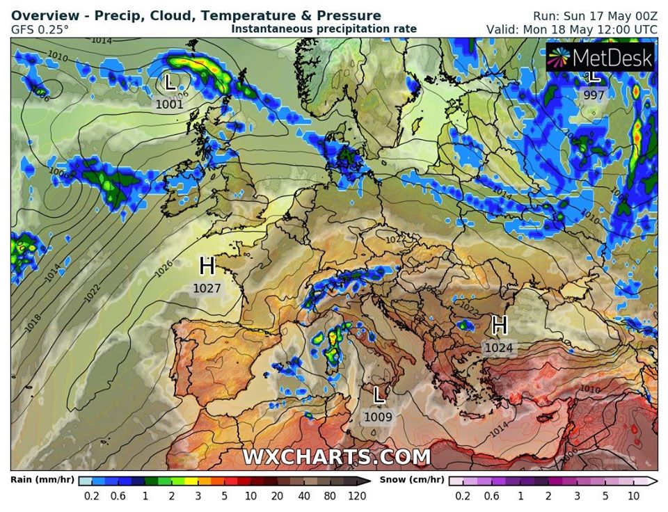 Она отметила, что циклоны Fiona и Erna обусловливают дожди и ветры в северной части Европы. В то же время атлантические антициклоны Quirinius Первый и Второй не будут пускать осадки высоким атмосферным давлением и организуют сухую солнечную погоду в большинстве стран западной, южной, центральной и восточной Европы. Только над Италией локальный циклон обусловит дождь.