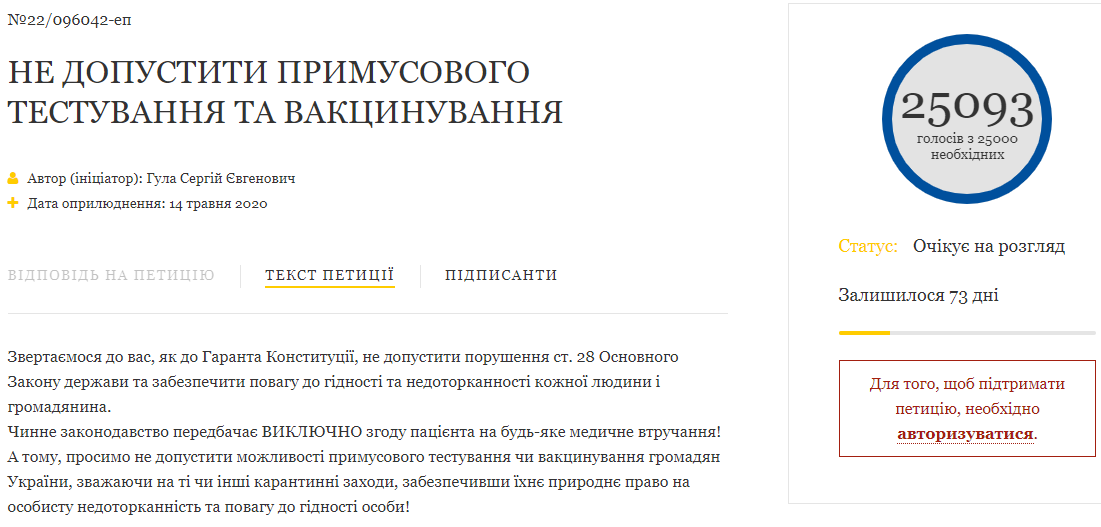 "Действующее законодательство предусматривает исключительно согласие пациента на любое медицинское вмешательство! А потому, просим не допустить возможности принудительного тестирования или вакцинации граждан Украины, учитывая те или иные карантинные мероприятия, обеспечив их естественное право на личную неприкосновенность и уважение достоинства личности!" - говорится в тексте петиции.