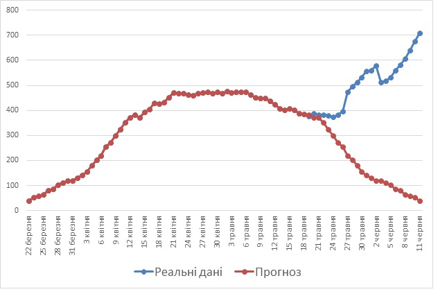 Как видно на опубликованном графике, прогноз количества подтвержденных диагнозов достаточно хорошо совпадал с реальными данными до середины мая, а затем количество заболевших пошло вверх.