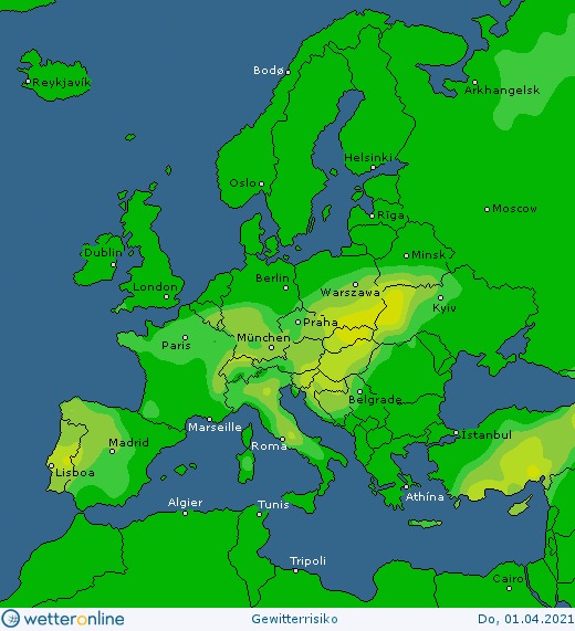 В западных областях появятся первые грозы. На карте указана зона возможных гроз - желтый или желтоватый цвет.