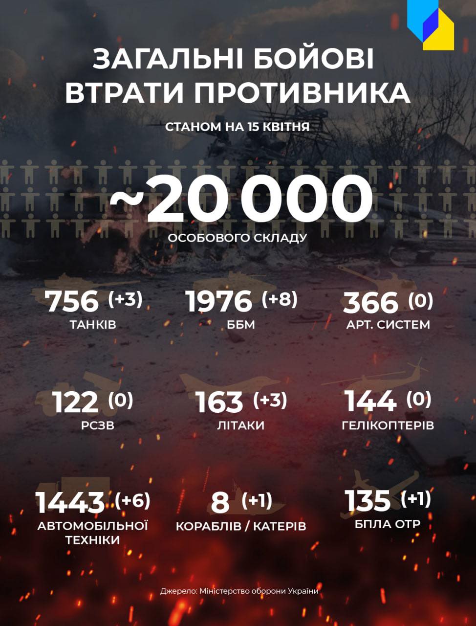 По официальным данным, потери российских оккупационных войск в Украине составляют около 20 тысяч живой силы.