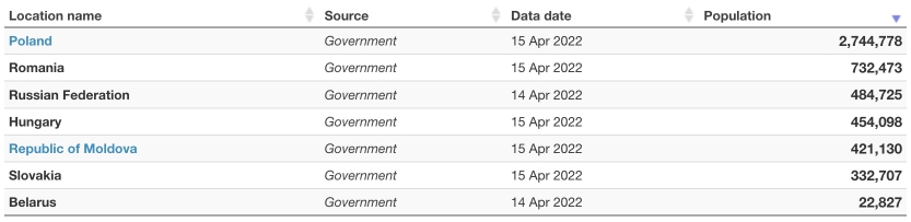Больше всего беженцев переехали в Польшу (более 2,74 млн) и Румынию (более 732,4 тысяч). Венгрия приняла 454 тысяч человек, Молдова - более 421 тысяч человек, Словакия - 332,7 тысяч человек.