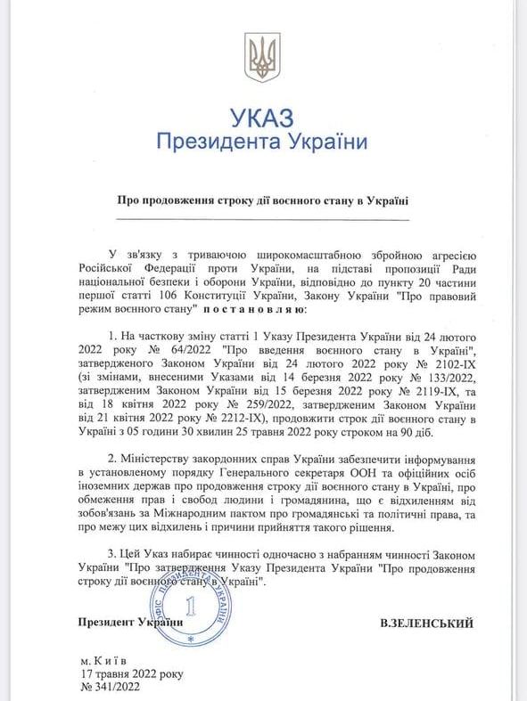 Указ Президента о продлении срока действия военного положения в Украине предусматривает, что военное положение будет продлено с 05 час. 30 мин. 25 мая на 90 суток (до этого срок действия военного положения продлевался каждый раз на месяц).