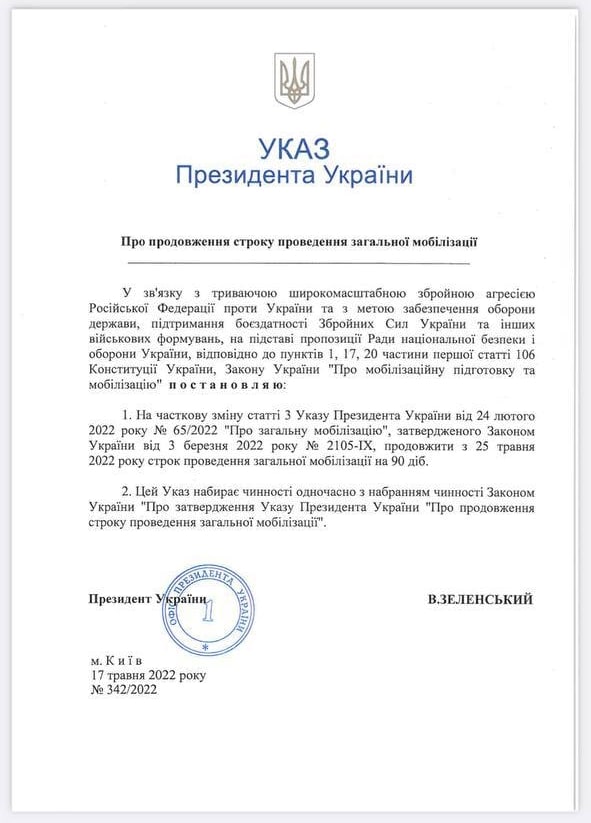 Другой указ предусматривает продление срока всеобщей мобилизации, который должен был закончиться 24 мая, еще на 90 суток.