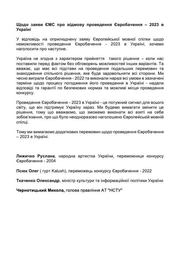"Мы честно выиграли Евровидение-2022 и выполнили все условия в указанные сроки относительно процесса согласования его проведения в Украине - предоставили ответы и гарантии по нормам безопасности и возможные места проведения конкурса. Проведение Евровидения-2023 в Украине - это мощный сигнал для всего мира, что он поддерживает Украину сейчас. Мы будем требовать изменить это решение, потому что считаем, что сможем выполнить все взятые на себя обязательства", - сказано в заявлении.