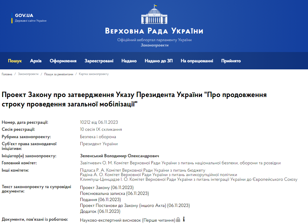 Так, Зеленский предлагает утвердить указы о продлении с 5 часов 30 минут 16 ноября 2023 года срок действия военного положения в Украине на 90 суток и продление общей мобилизации с 16 ноября на 90 суток.