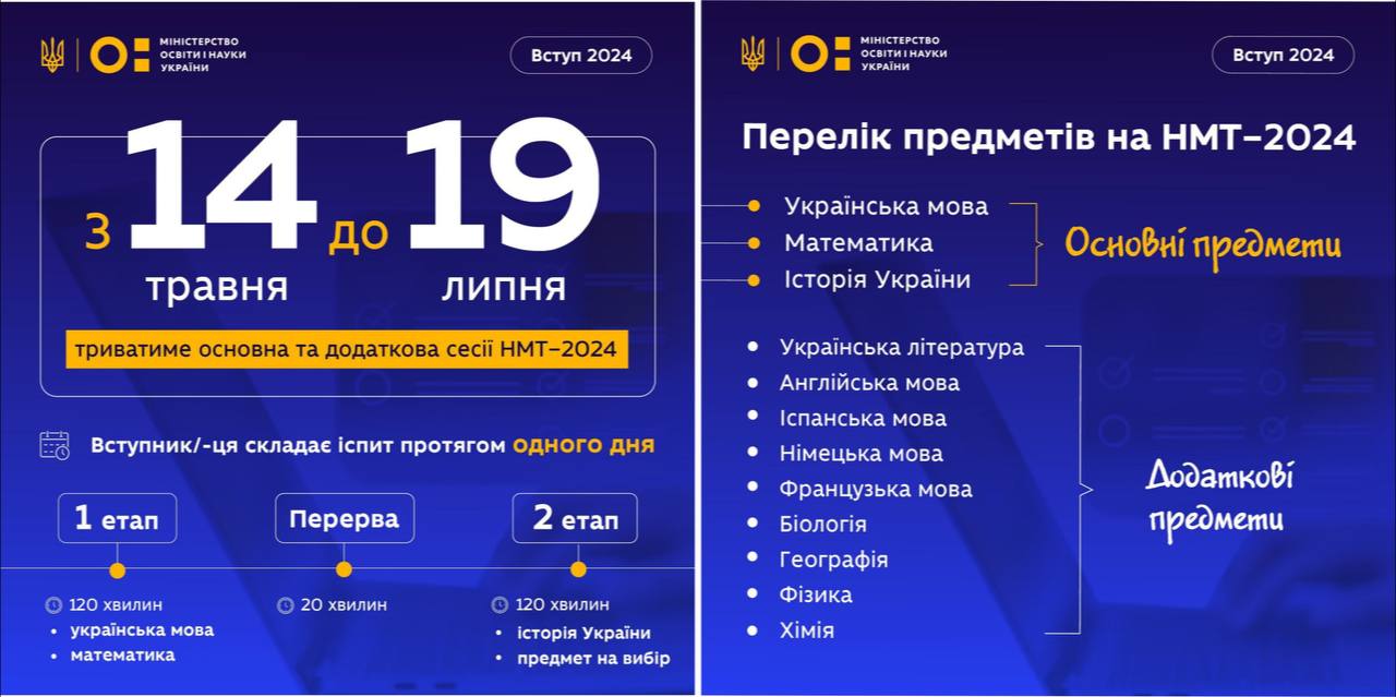 Абитуриенты будут сдавать экзамен по четырем предметам: три (история Украины, математика и украинский язык) обязательны, еще один можно выбрать. Основная и дополнительная сессии НМТ будут продолжаться в период с 14 мая по 19 июля.