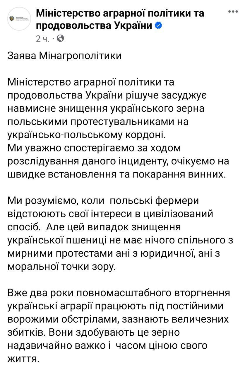 Министерство аграрной политики и продовольствия Украины осудило умышленное уничтожение украинского зерна польскими протестующими на украинско-польской границе и пригласило польских фермеров приехать в Украину.