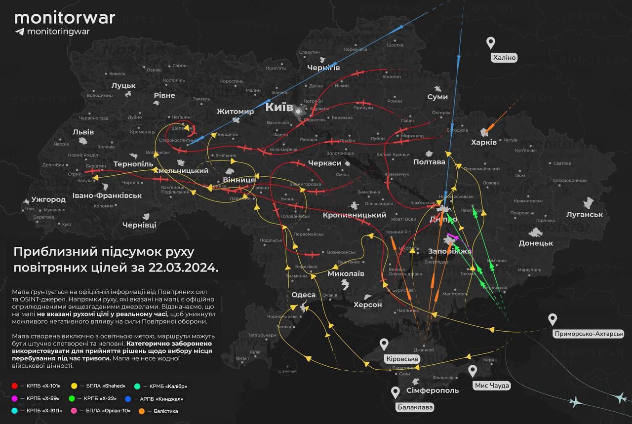 Monitorwar показал приблизительный маршрут ракет во время сегодняшнего обстрела оккупантов.