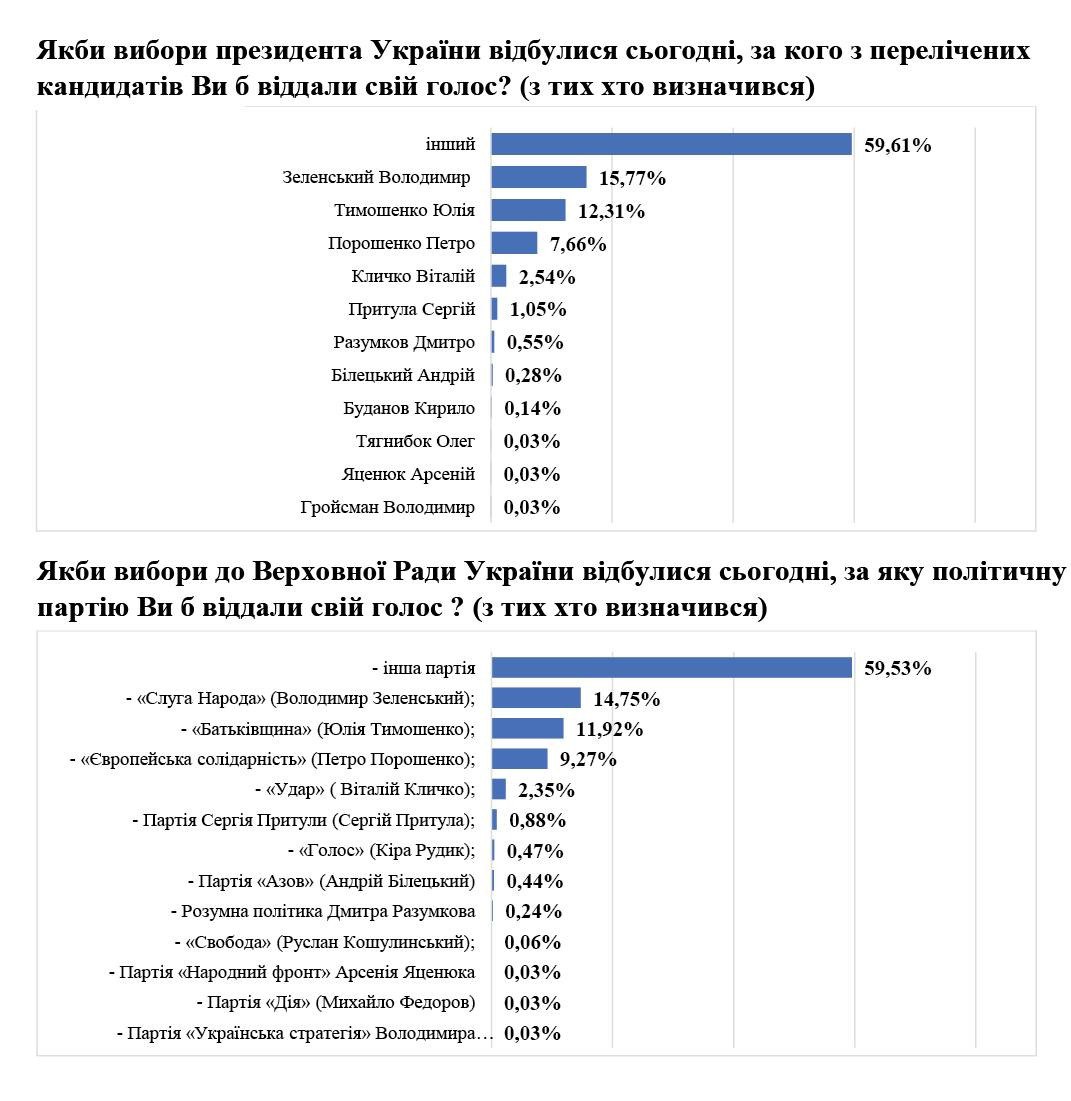 Среди опрошенных граждан, которые определились и пришли бы на избирательные участки для голосования за президента Украины, тройка лидеров предпочтений выглядит следующим образом: за Владимира Зеленского проголосовали бы 15,7%; за Юлию Тимошенко – 12,3%; за Петра Порошенко – 7,6%.