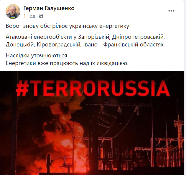 По данным Галущенко, в ходе ракетных обстрелов Россия пыталась поразить объекты энергетики в Запорожской, Днепропетровской, Донецкой, Кировоградской и Ивано-Франковской областях. Последствия атак сейчас уточняются, но энергетики уже приступили к работам по ликвидации повреждений на пострадавших объектах.