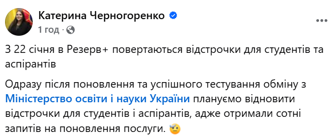 "Мы получили сотни запросов на возобновление этой услуги, и это решение будет полезным для всех студентов, которые хотят завершить образование без вмешательства мобилизации", - заявила Черногоренко.