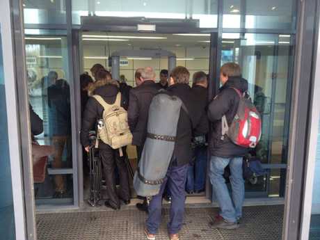 В здание, где должна состояться пресс-конференция, пройти можно только после тщательного досмотра личных вещей.