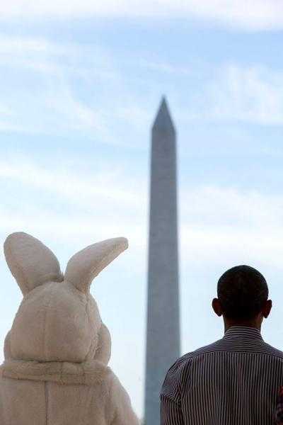 При этом американский президент добавил оригинальное фото, на котором он смотрит на монумент Вашингтона в компании "пасхального кролика".