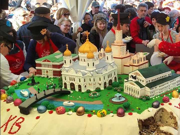 На Пушкинской площади в Москве всем желающим раздавали кусочки пасхального кулича весом 900 кг.