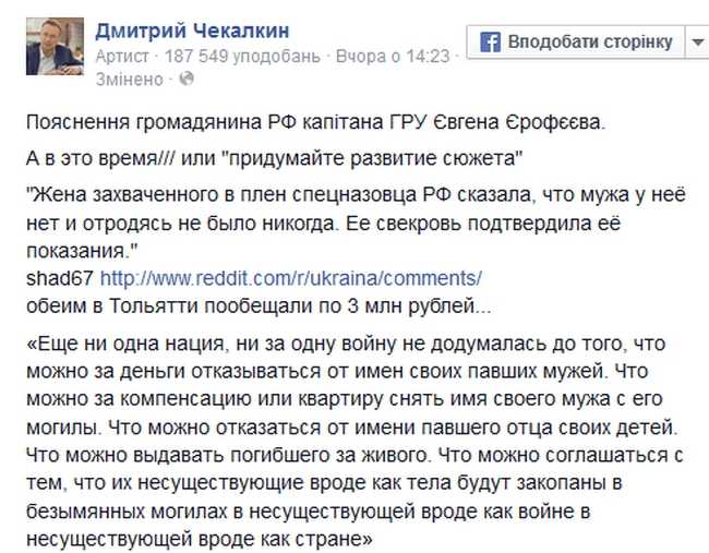 «А в это время/// или «придумайте развитие сюжета». «Жена захваченного в плен спецназовца РФ сказала, что мужа у неё нет и отродясь не было никогда. Ее свекровь подтвердила её показания»... обеим в Тольятти пообещали по 3 млн рублей...», - сообщает Чекалкин.