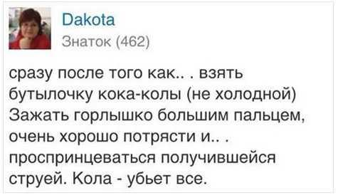 «Сразу после того как.. взять бутылку кока-колы (не холодной) зажать горлышко пальцем, очень хорошо потрясти и проспринцеваться полученной струей. Кола — убьет все», — написала пользователь.
