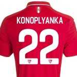 В официальном магазине стартовала продажа новой формы игроков испанской ФК «Севильи». Футболки с фамилией украинского легионера KONOPLYANKA на спине и номером «22», который присвоен футболисту, можно купить за 74 евро.