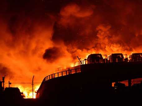 Сообщается, что несмотря на непрекращающиеся попытки потушить возгорание, пламя усилилось и оставляет черные клубы дыма в небе над местом происшествия.