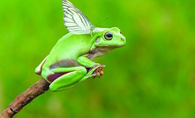 “На самом деле, я собирался снимать древесную лягушку, которая сидела на кончике очень тонкая, толщиной с человеческий палец ветке и очень ловко зацепилась за неё. Но рядом неожиданно появилась бабочка и взгромоздилась ей прямо на спину. Это было невероятно: бабочка села так, что стало казаться будто эти крылья принадлежат лягушке, которая вот-вот взлетит, — рассказывал фотограф. — Мне надо было действовать быстро, потому что бабочка сидела в таком положении всего четыре секунды”.