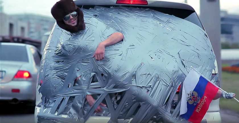 В данном случае суть спора состояла в том, чтобы проехаться по городу примотанным скотчем к машине.