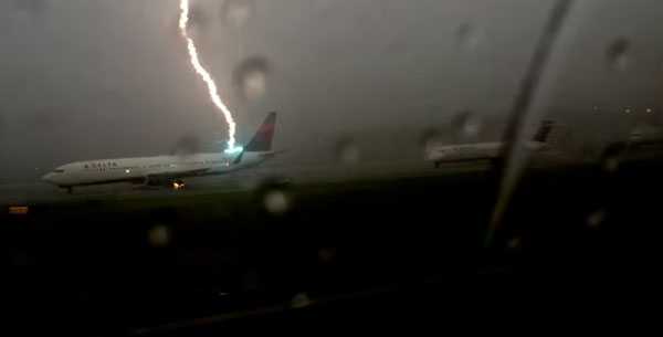 Молния с мощным электрическим зарядом ударила по хвостовой части лайнера, стоявшего на взлетной полосе аэропорта Атланты. Видео снял на камеру один из пассажиров, пребывающий в зале ожидания. К счастью, никто не пострадал, так как все рейсы были отменены из-за штормового предупреждения.
