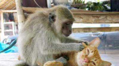 Недавно отчаянная обезьянка попыталась разбудить сонного кота. Проворное животное лезло коту в уши, бегало прямо по нему и даже пережимало горло. Но все старания оказались напрасными.