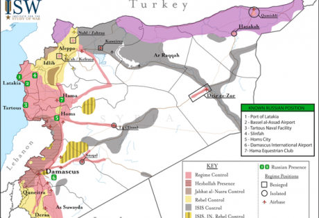 Основные позиции сил ВС РФ, поддерживающих сирийского лидера Башара Асада в борьбе против террористов "Исламского государства", на данный момент сосредоточены в нескольких регионах (отмечены зеленым): Дамаск (авиабаза), Латакия (авиабаза), Тартус и Хомс, Бассель Аль-Сад (авиабаза) и Слинхаф. Параллельно с российской армией, среди иностранных контингентов на территории, подконтрольной Сирии находятся базы иранских вооруженных сил.