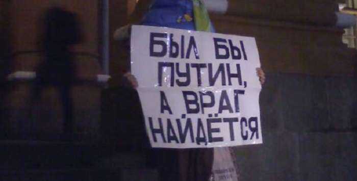 Позже к нему присоединились и другие московские активисты. Они принесли плакаты с такими лозунгами: «Был бы Путин, а враг найдется», «Путина понесло к зияющим высотам», и т. д.