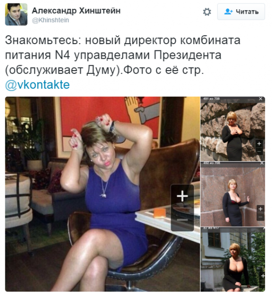 Вовк является директором комбината питания №4 управделами президента России, пишет "Московский комсомолец". "А вот это фото новый главный повар Госдумы со своей страницы сегодня удалила. Теперь в Думе будет весело и вкусно", – написал парламентарий в Twitter.