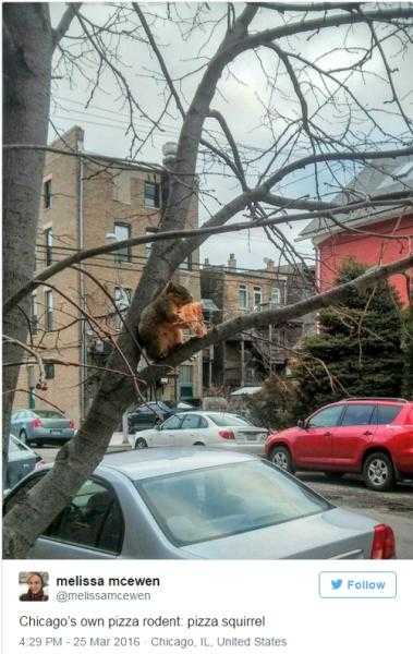 Животное поедало привлекательный кусочек пиццы, удобно устроившись на дереве. Одна из пользователей Twitter Мелисса МакИвен опубликовала фото белки, назвав ее Pizza Squirrel.