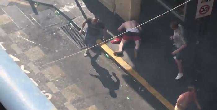 На видео показано, что топа озверевших российских фанатов окружила английского фана и начинает его избивать даже тогда, когда тот упал на землю, россияне били англичанина ногами по голове.