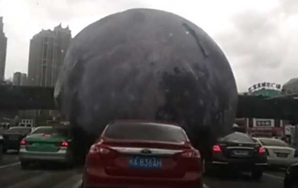 В китайском городе Фучжоу гигантский шар в расцветке Луны прокатился по автомобилям на трассе.