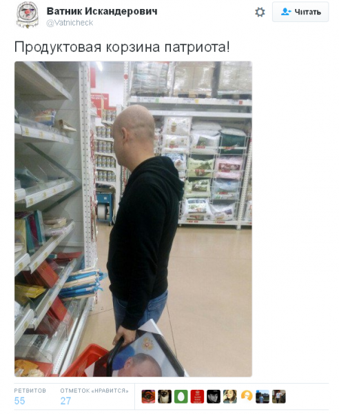 "Продуктовая корзина патриота!" — с сарказмом написал пользователь аккаунта "Ватник Искандерович". При этом комментатор его сообщения отметил и "траурную рамку" на портрете.